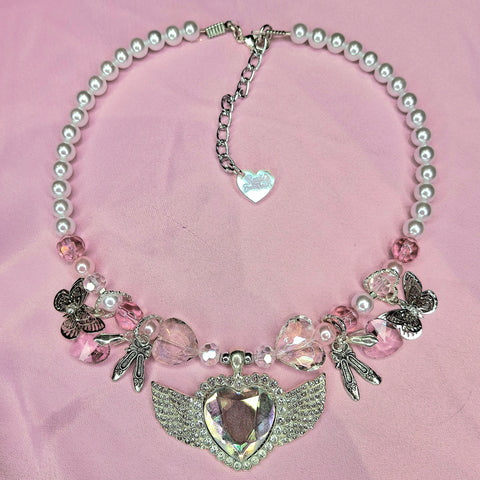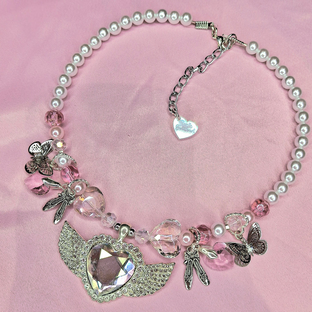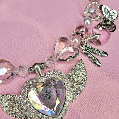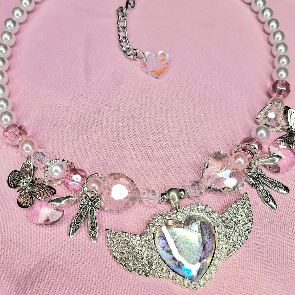 A stunning one-off hand beaded necklace featuring a silver diamante studded angel wing charm with an iridescent crystal centre, silver ballet shoe and butterfly charms, pink heart crystals and iridescent beads 🩷🎀