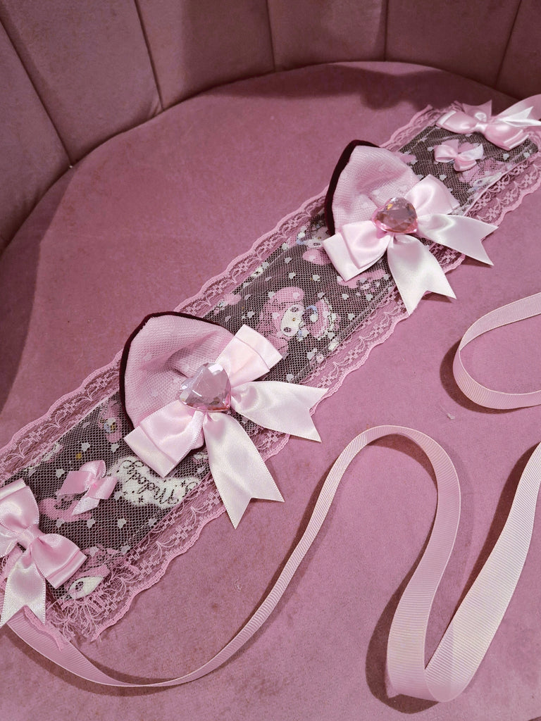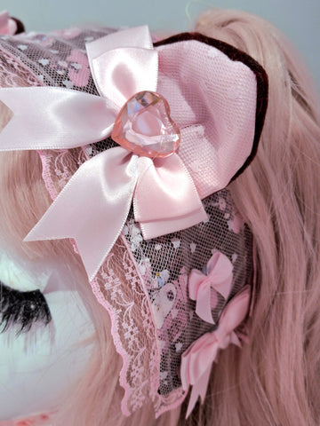 A beautiful headdress featuring heart mesh layered over kawaii melo print fabric, pink lace trim, bows with heart gems and adorable kitten ears with red velvet 🩷🎀