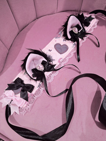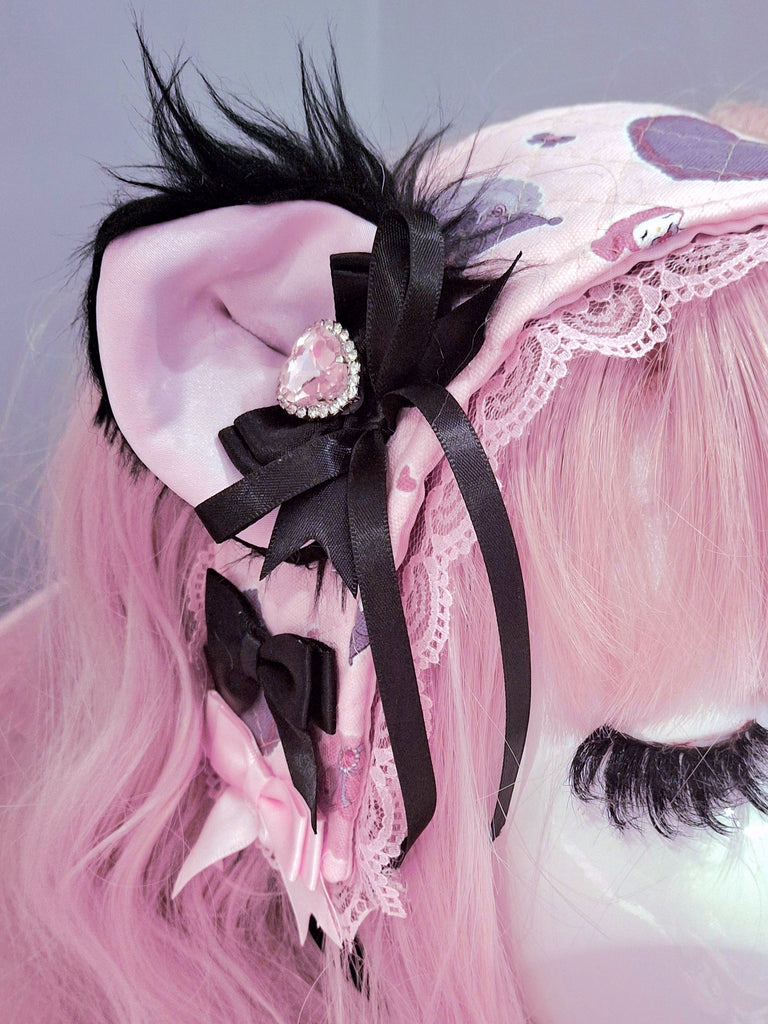 A beautiful Jirai Kei style headdress featuring creepy kawaii kuro-mi & melo print fabric, pink lace frill trim, black satin bows with crystal heart gems and adorable kitten ears 🩷