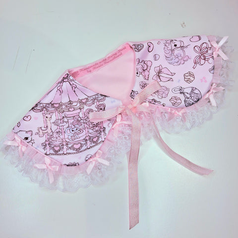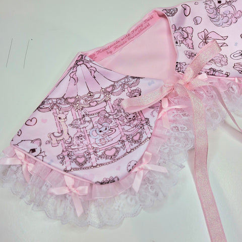 The Coquette Carousel illustrations featured on a soft duchess satin silk collar with pretty bow lace, pink satin bow and iridescent ribbon tie 🎀🎠