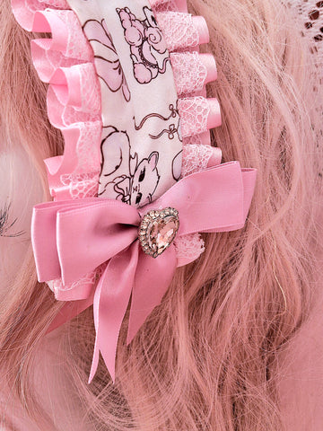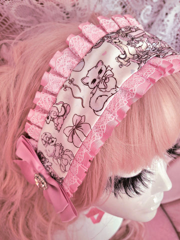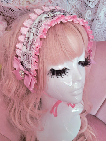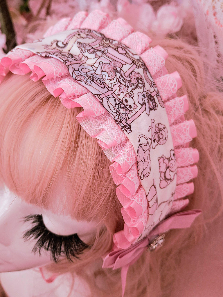 The coquette carousel illustrations featured on a soft duchess satin silk headdress with pink ruffled lace, satin bows and crystal heart gems 🎀🎠