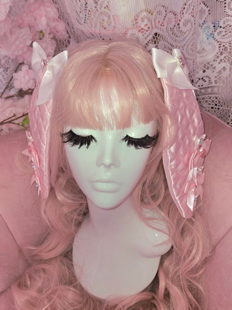 Beautiful statement bunny ears featuring pink quilted satin sourced from Japan, white & baby pink satin bows and crystal hearts 🎀