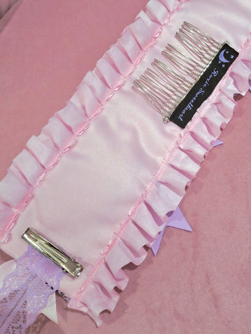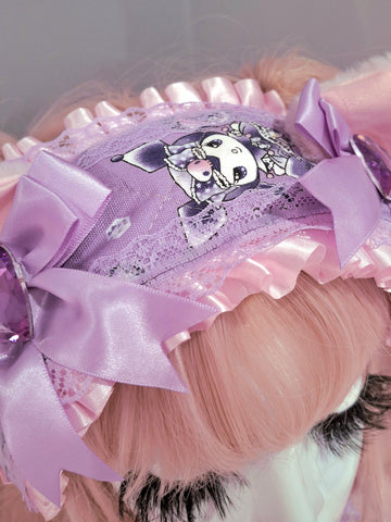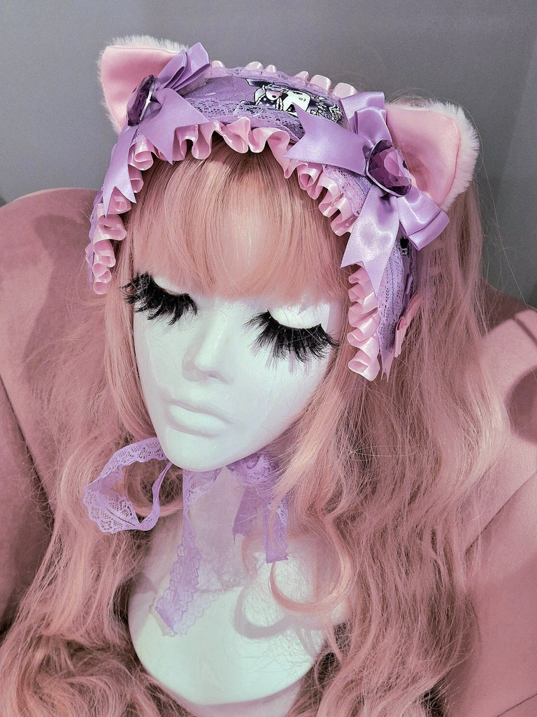 A beautiful headdress featuring creepy kawaii kuro-mi print fabric, pink sarin frill trim, lilac satin bows with heart gems and adorable kitten ears 💜🎀
