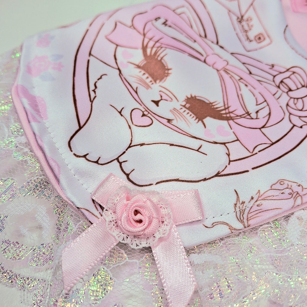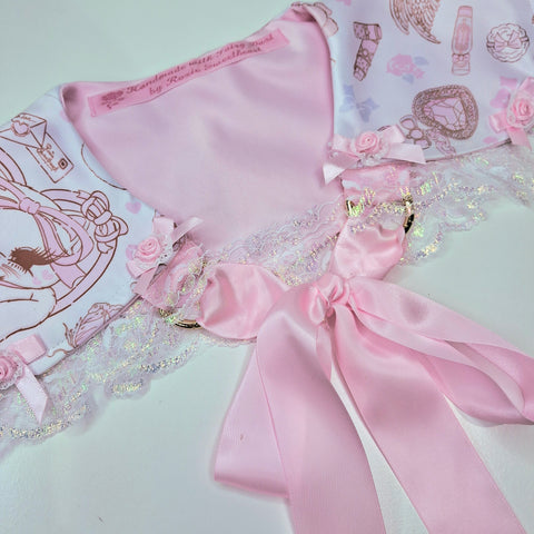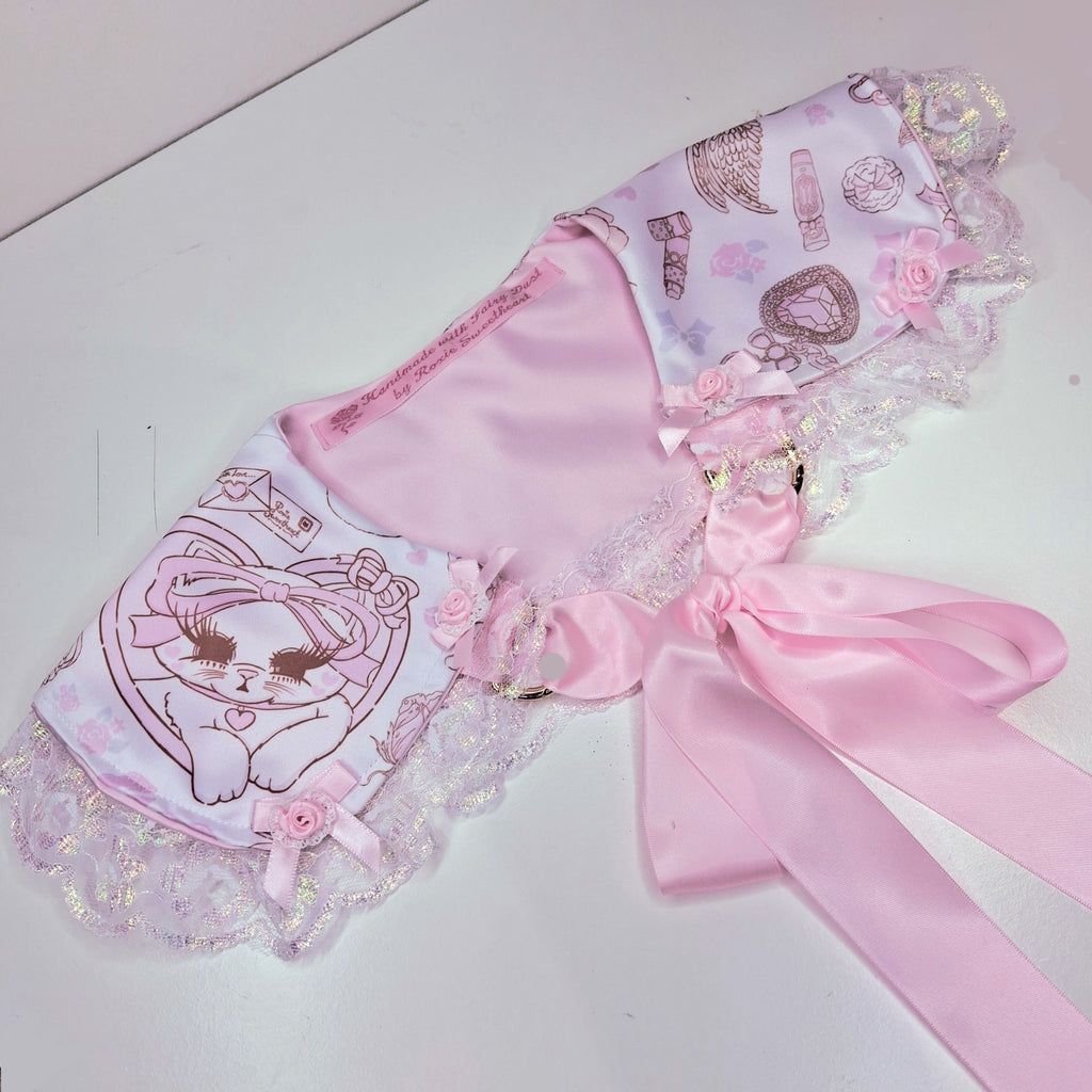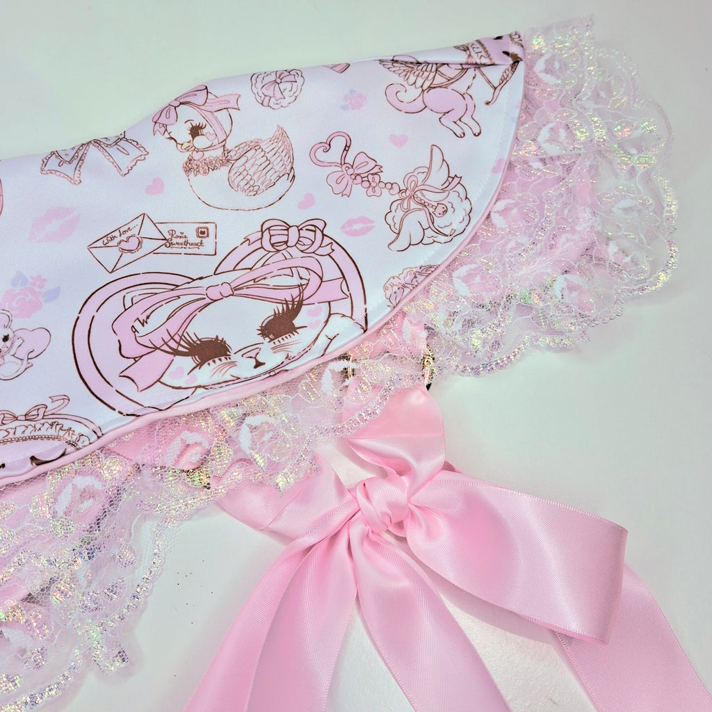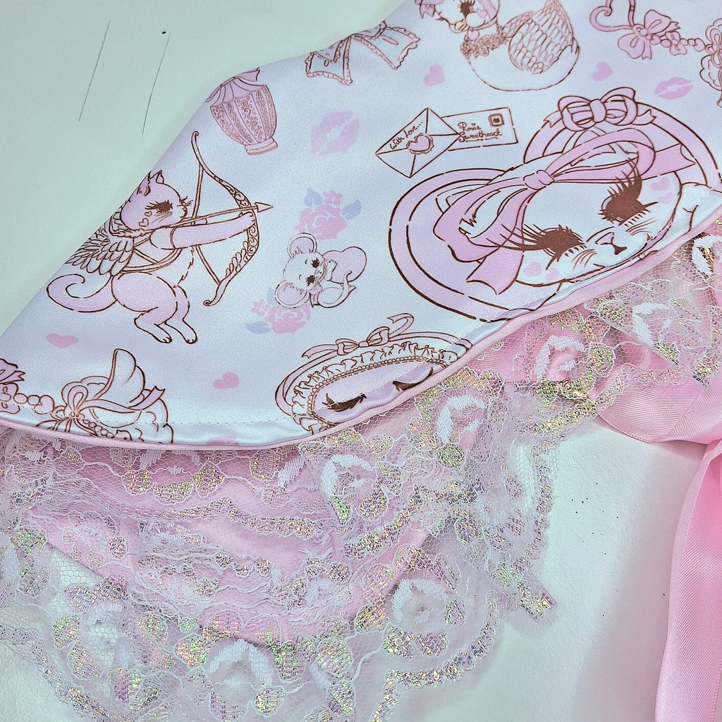 The new Love Letters illustrations featured on a soft duchess satin silk collar with pretty iridescent bow lace, pink satin bows, wide satin ribbon tie and gold d rings 🎀🎠