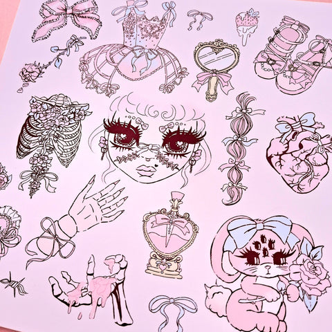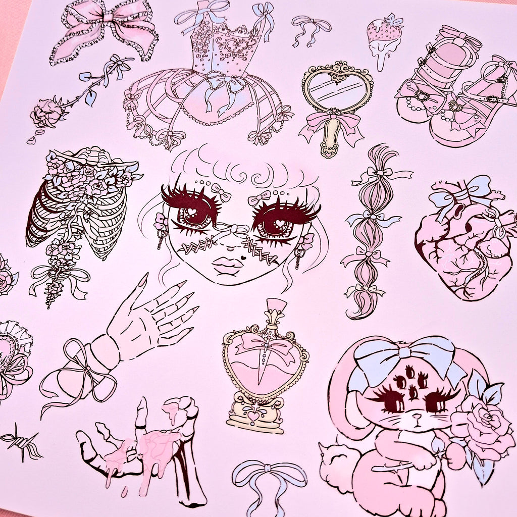 🎀 𝖕𝖔𝖎𝖘𝖔𝖓 𝖑𝖚𝖑𝖑𝖆𝖇𝖞 🎀 A square art print featuring a bitter sweet theme with hand-drawn illustrations ~ inspired by Blythe & Pullip dolls, lolita J Fashion, vintage kitsch art and fairytales 🩷