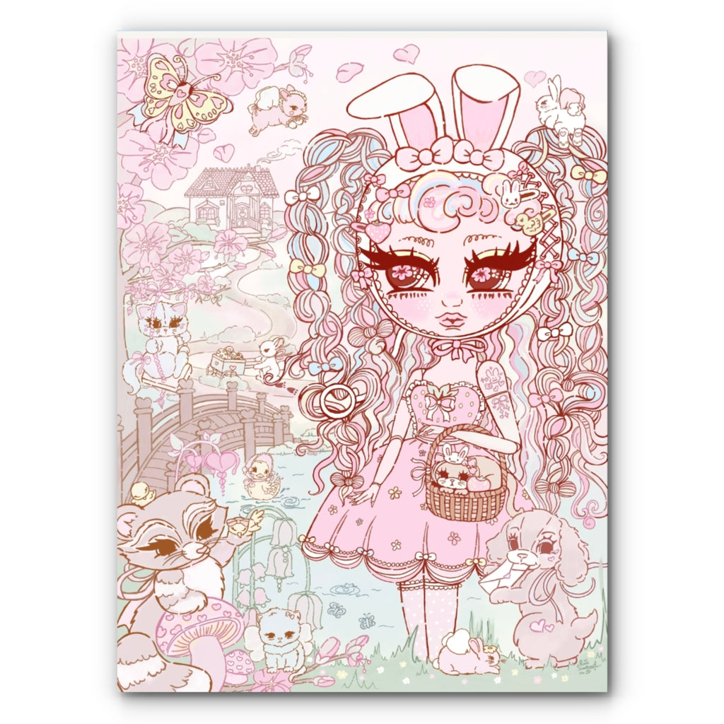 ๐ธ An A4 art print featuring the Sakura in Blossom hand-drawn illustration with a cutesy spring picnic theme baby animals and kitsch motifs ๐ธ